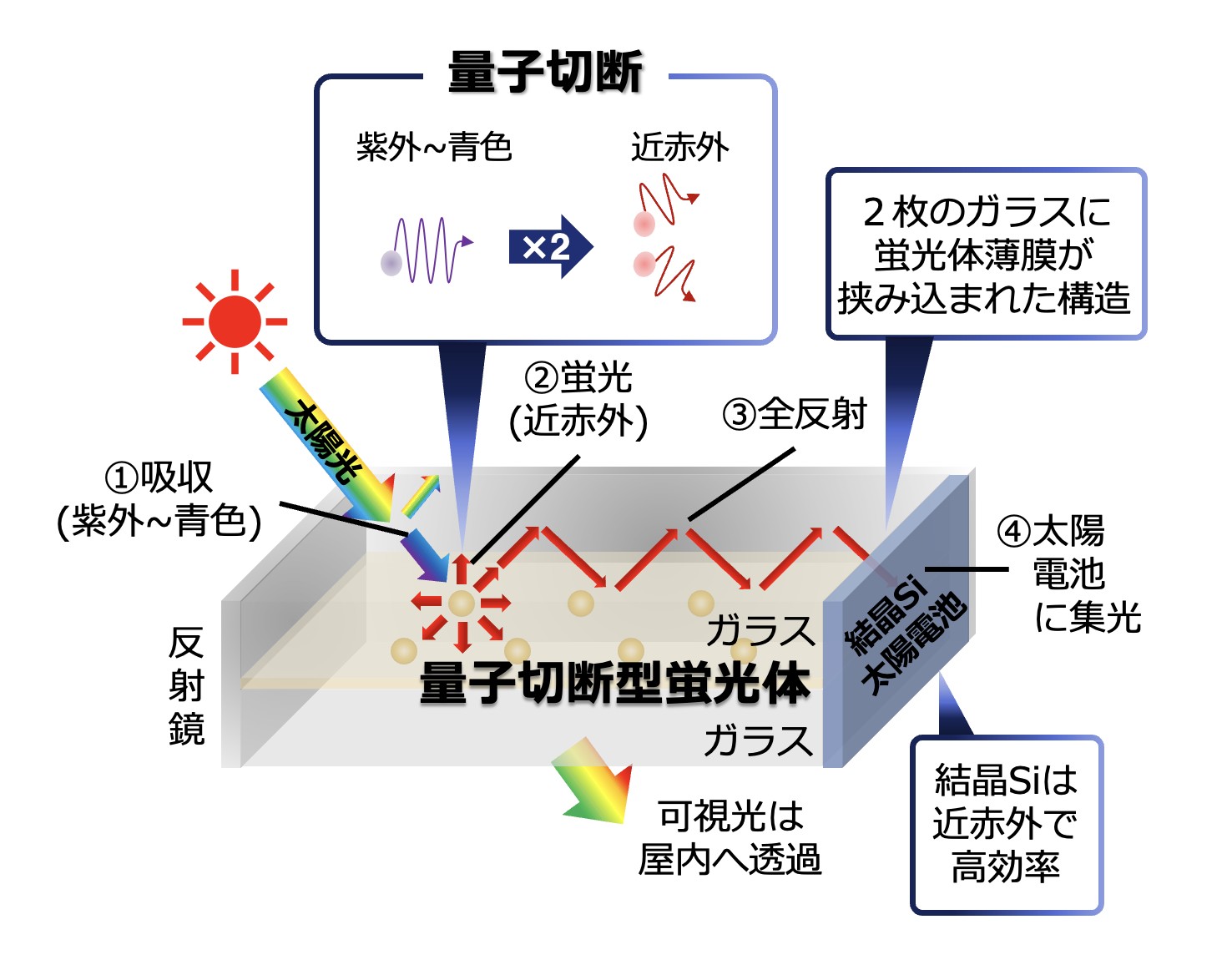 量子切断型蛍光体(高エネルギーの紫外〜青色光1光子を低エネルギーの近赤外光最大2光子に変換する蛍光体)薄膜を実現し、それを平板型太陽光集光器Luminescent Solar Concentrator(LSC)型太陽電池に応用することを目的とする研究です。2050年のカーボンニュートラル達成に向け、脱炭素化の加速が求められています。特に都市部では建物からのエネルギー消費およびCO2排出の割合が大きく、建築分野における対策が重要です。日本は災害が多く,建物単位でのエネルギー自給によるレジリエンス向上も求められています。このような背景から、未活用である窓面への発電機能の付加を目指しています。